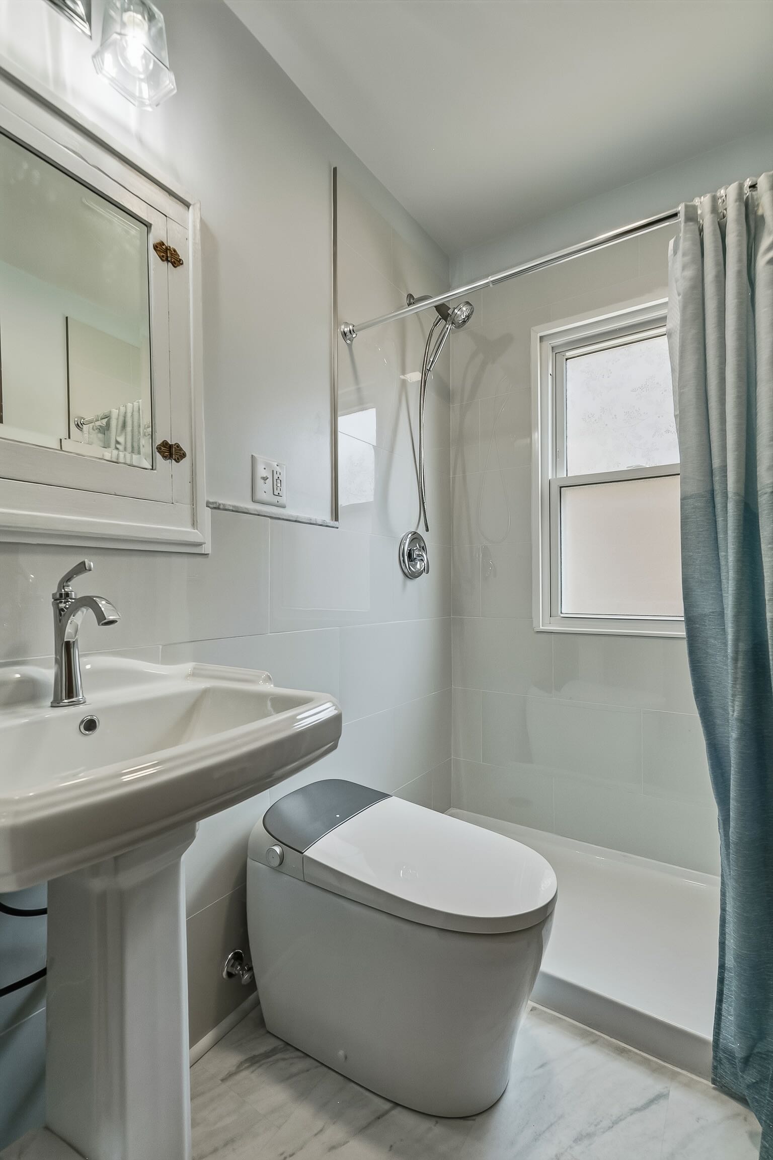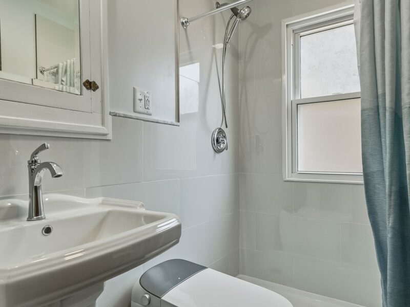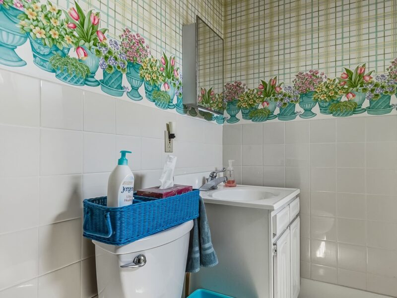 Inside, the main level offers a bright and open layout with a spacious living room, formal dining area, kitchen, and an added family room. You’ll also find a sun porch, main-level laundry, and two bedrooms, along with a beautifully remodeled 3/4 bathroom featuring a large tiled shower, bidet toilet, pedestal sink, and updated fixtures. A hallway with abundant built-in cabinetry provides excellent storage.