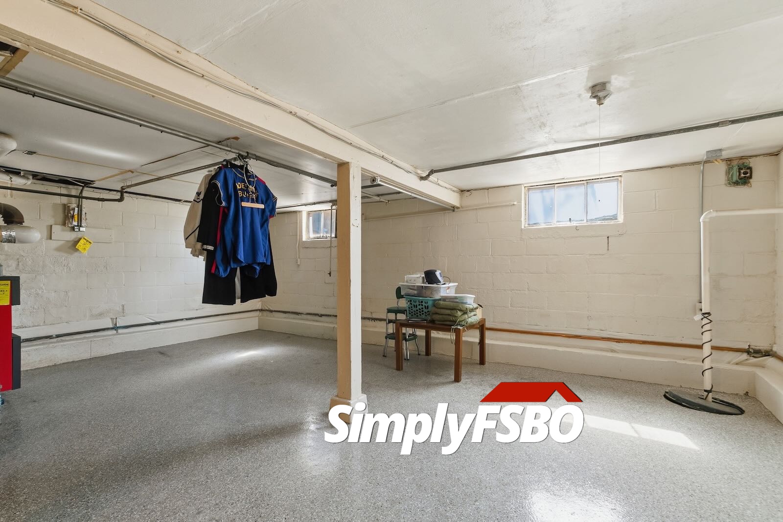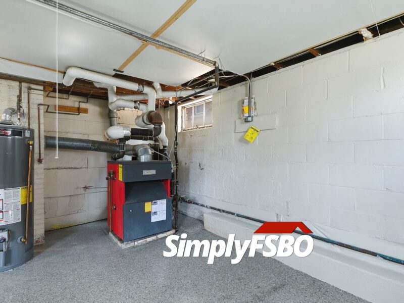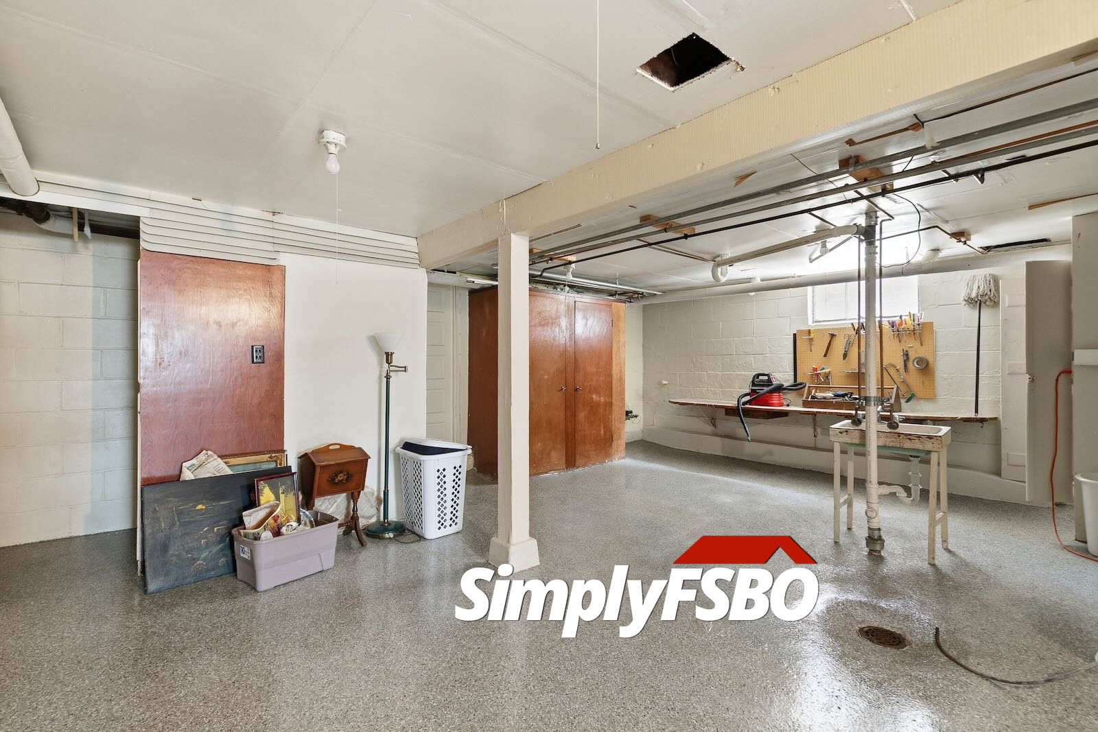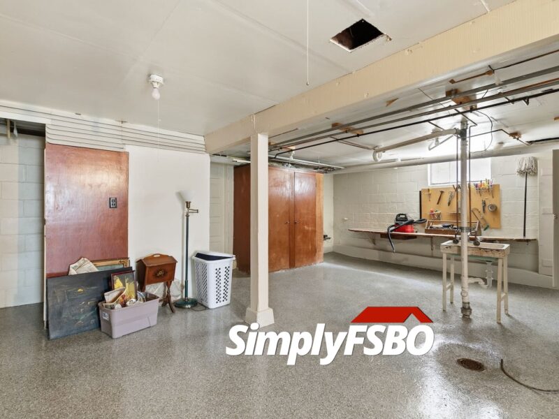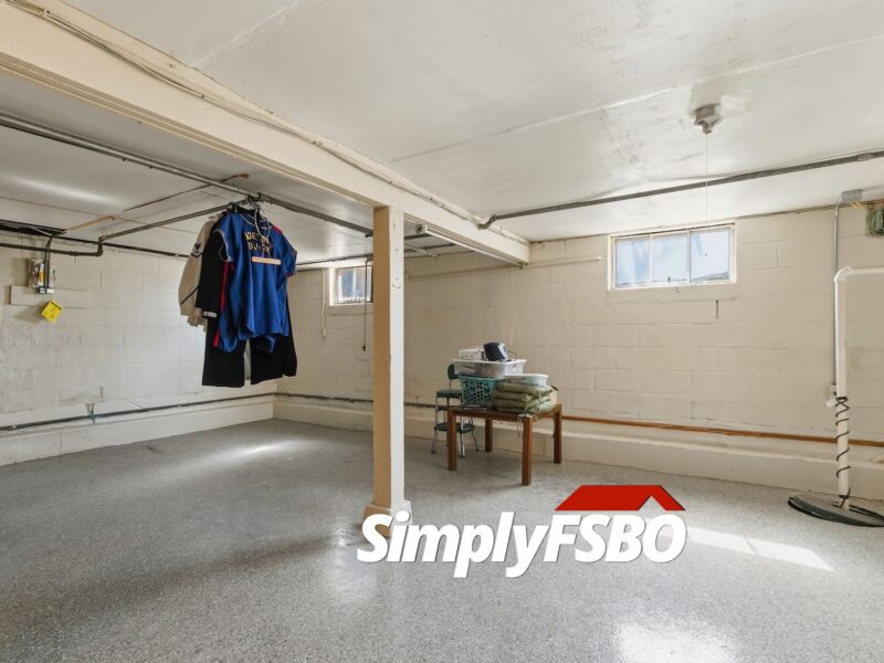 The basement is clean and functional, featuring epoxy-coated floors, waterproofing with a sump pump, a shower, utility sink, built-in cabinetry, and a large workbench, ideal for hobbies or projects.