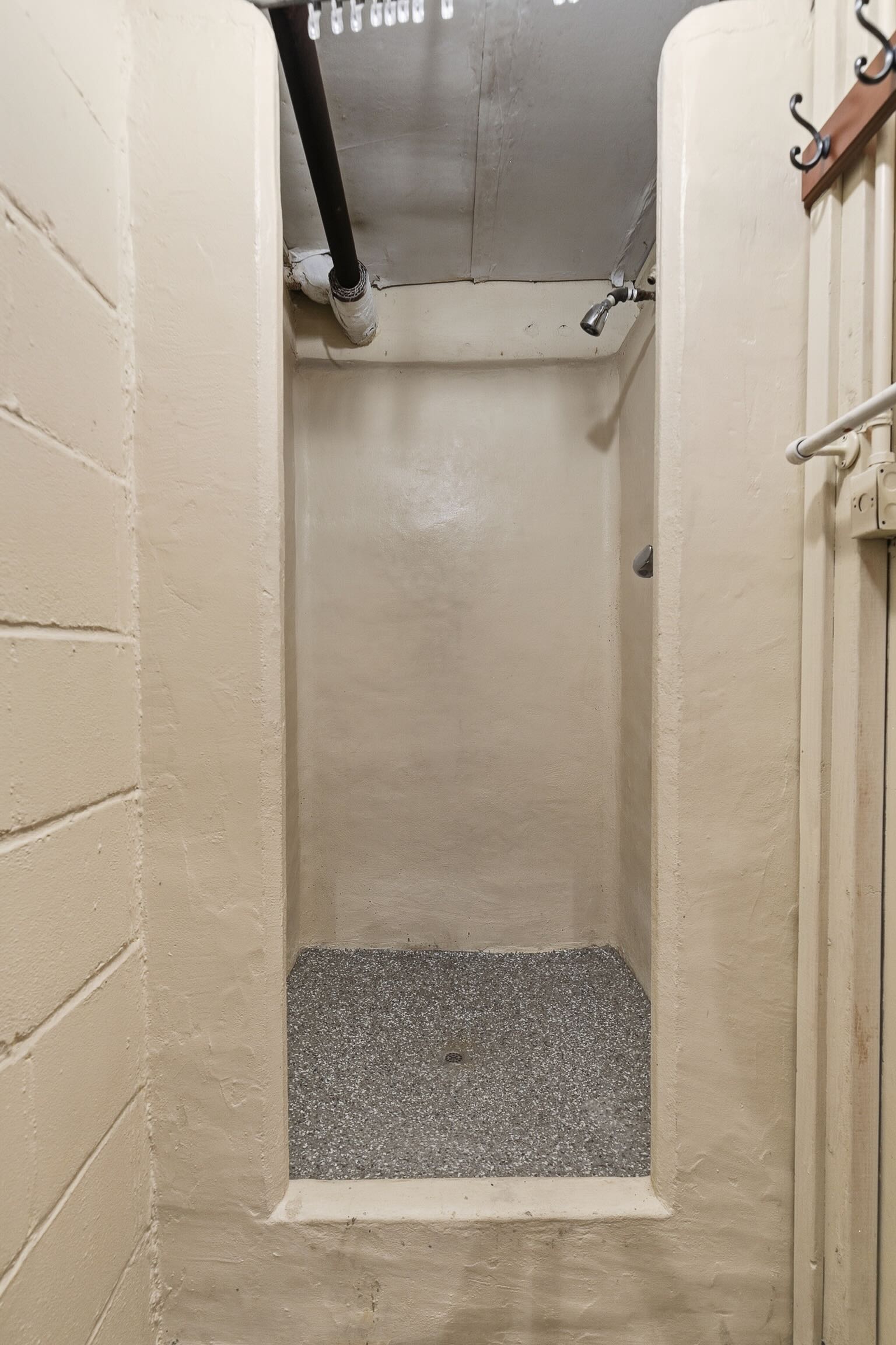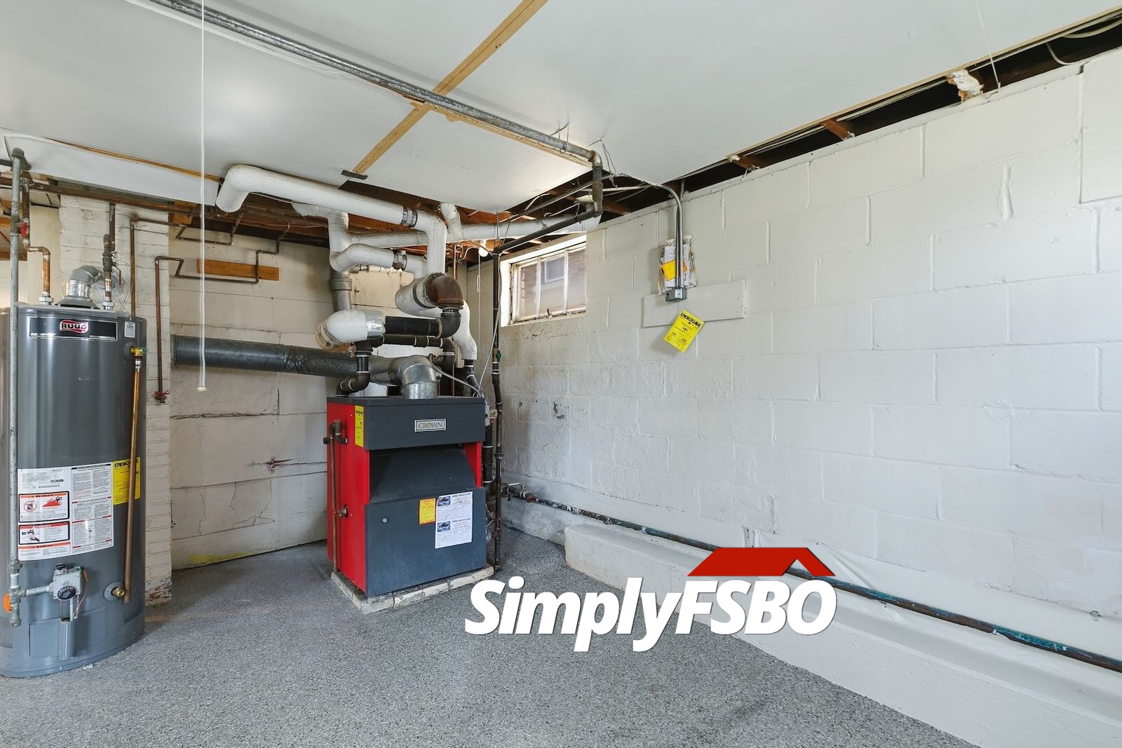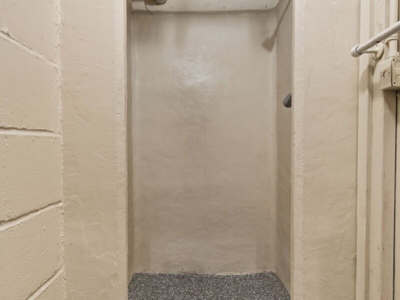 The basement is clean and functional, featuring epoxy-coated floors, waterproofing with a sump pump, a shower, utility sink, built-in cabinetry, and a large workbench, ideal for hobbies or projects.